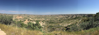 We found a new park, of course we traveled thru states we haven't before! We were in North Dakota and stopped at a rest area. It had a Ranger Station as a part of the stop and a 1 mile loop trail. It was only 98 there and the feels like was...98! I don't care what anyone says, whether it's humid or dry that's hot! Here is the write up on the area by the NPS.org website: "Theodore Roosevelt National Park is a United States National Park comprising three geographically separated areas of badlands in western North Dakota. The park was named for U.S. President Theodore Roosevelt. The park covers 70,446 acres of land in three sections: the North Unit, the South Unit, and the Elkhorn Ranch Unit."